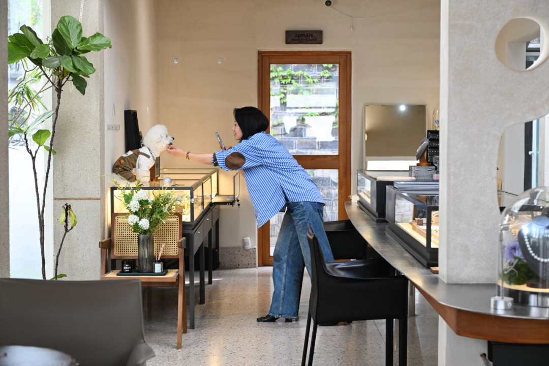 江苏南京一家店铺的店主跟宠物互动。季春鹏摄(新华社)