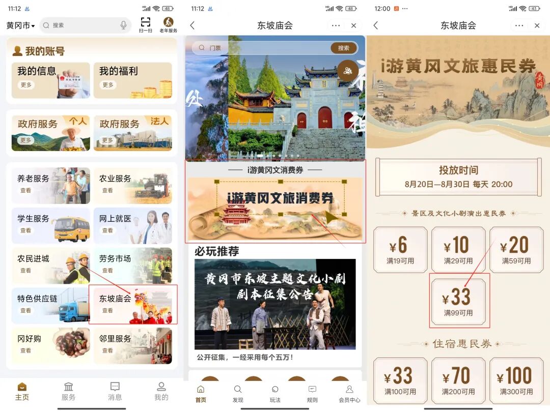 2.用券地点:“i游黄冈”文旅消费券活动期间,消费者抢领的消费券可以在“东坡庙会”模块消费相关产品线上支付时使用。