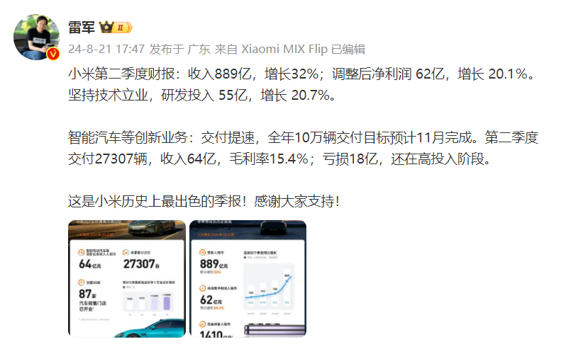 此前,雷军在个人账号上公布小米第二季度财报,并称这是小米历史上最出色的季报:收入889亿,增长32%;调整后净利润 62亿,增长 20.1%。坚持技术立业,研发投入 55亿,增长 20.7%。
