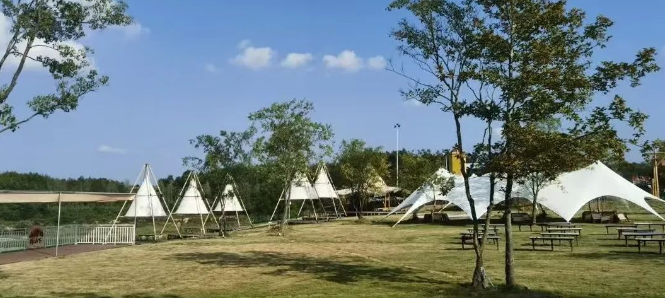 距离武红高速(红安南站)匝道约1公里的湖北红安锦绣铜锣景区“河畔星空露营地”,位于倒水河畔白马山下。露营地以轻奢风情为特色,集帐篷天幕、美食烧烤、咖啡清酒、曼舞轻歌、休闲度假、遛娃团建等为一体,为游客倾心打造一个“人与自然、简约与奢华、静谧与宣泄”相互交融的露营盛宴。