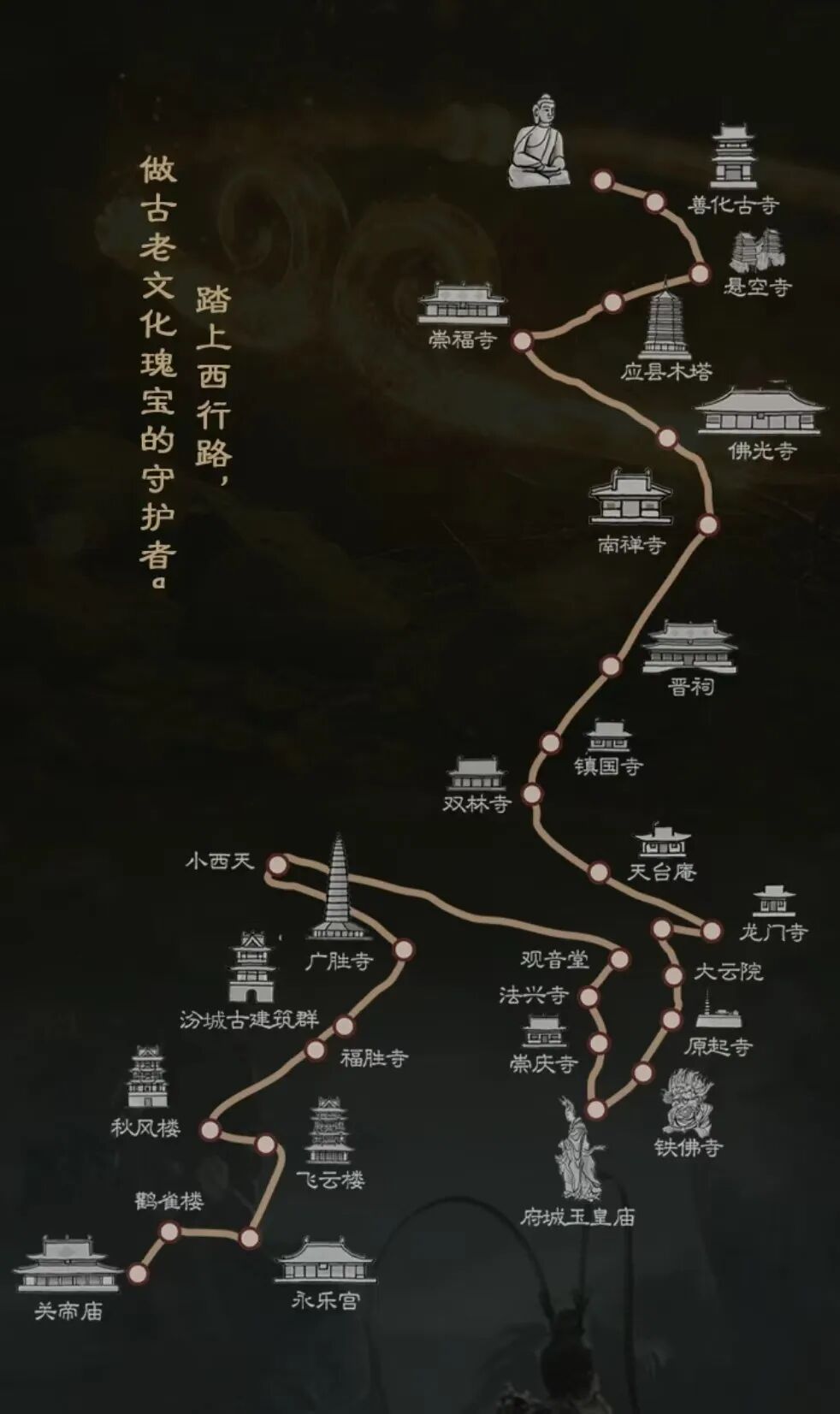 于是山西发布了“跟着悟空游山西”主题路线“重走西游 土木华章 山西古建自驾游”线路古建华章与彩塑满堂晋北线楼阁飞云与神仙洞天晋南线神奇上党与绝美造像晋东南线