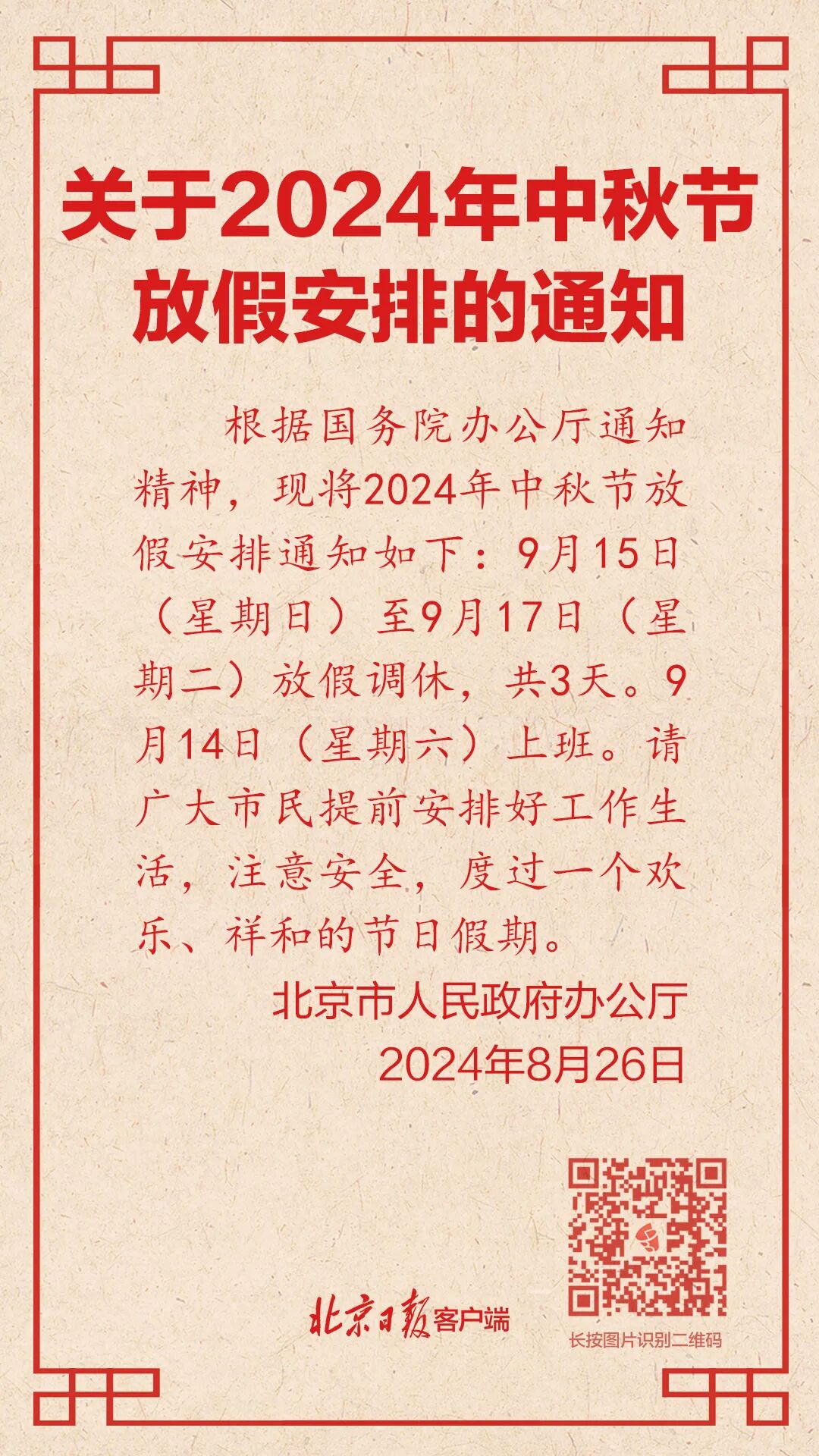 26日,北京发布中秋节放假通知: