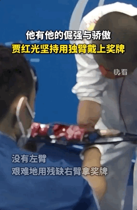 贾红光艰难地用残缺的右臂挑起奖牌,戴在胸前