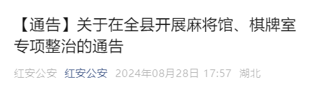 为了净化社会风气,严厉打击涉赌违法行为,根据《中华人民共和国刑法》《中华人民共和国治安管理处罚法》等法律规定,红安县公安局决定从2024年8月26日开始,对带有赌博性质的麻将馆(含自助麻将室)、棋牌室进行专项清理整治。现将有关事项通告如下: