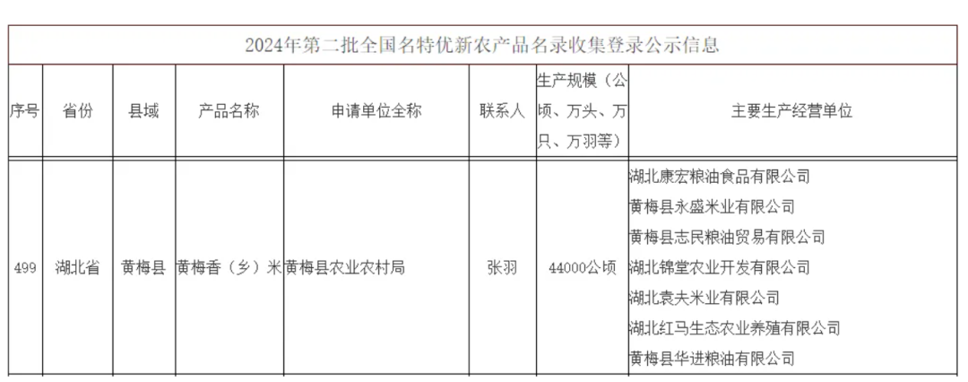 农业农村部农产品质量安全中心公布,2024年第二批全国名特优新农产品名录,全国共有737个产品入选,其中黄梅县“黄梅香(乡)米”上榜。