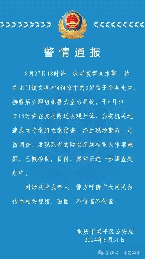 8月31日,重庆梁平区公安局发布警情通报:3岁走失男童的遗体已于29日被找到,经走访调查,死者的两名亲属有重大作案嫌疑,已被控制。目前,案件正在调查中。