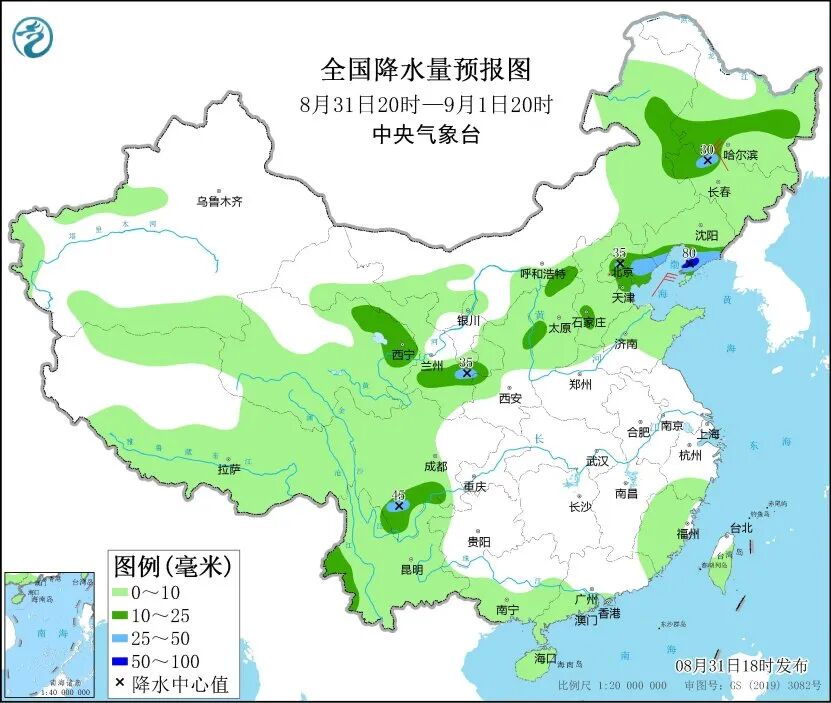 中央气象台预计,8月31日20时至9月1日20时,内蒙古东北部、黑龙江中部和西南部、吉林西部、辽宁南部、青海北部和东部、甘肃中南部、河北东北部、北京北部、天津大部、四川南部、云南西部等地部分地区有中到大雨,其中,辽东半岛等地局地有暴雨。