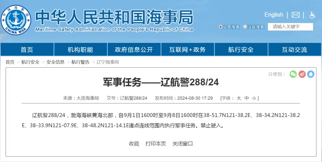 据中国海事局网站消息,大连海事局发布航行警告,9月1日16时至9月8日16时,渤海海峡黄海北部部分海域执行军事任务,禁止驶入。