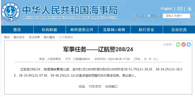 据中国海事局网站消息,大连海事局发布航行警告,9月1日16时至9月8日16时,渤海海峡黄海北部部分海域执行军事任务,禁止驶入。