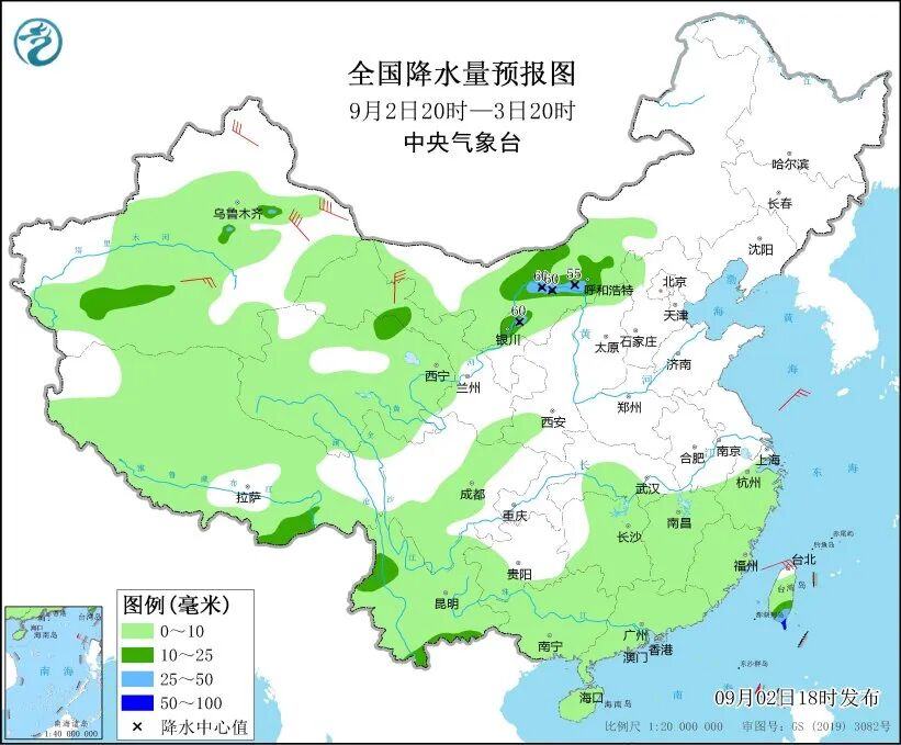 中央气象台预计,2日20时至3日20时,内蒙古中部、新疆南疆盆地南部、西藏东南部、青海北部、宁夏北部、云南西部和东南部、台湾岛等地部分地区有中到大雨,其中,内蒙古河套地区等地部分地区有暴雨。
