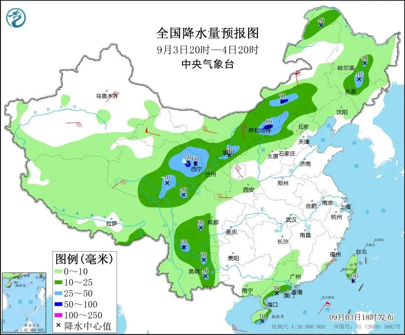 中央气象台预计,3日20时至4日20时,内蒙古中部和东北部、甘肃中部、青海中东部、黑龙江南部、吉林中部、山西北部、河北西北部、四川南部、云南东部、广东西南部沿海、海南岛南部和东部、台湾岛南部等地部分地区有中到大雨,其中,内蒙古中部、青海东部、云南北部、四川南部、台湾岛南部等地部分地区有暴雨或大暴雨。