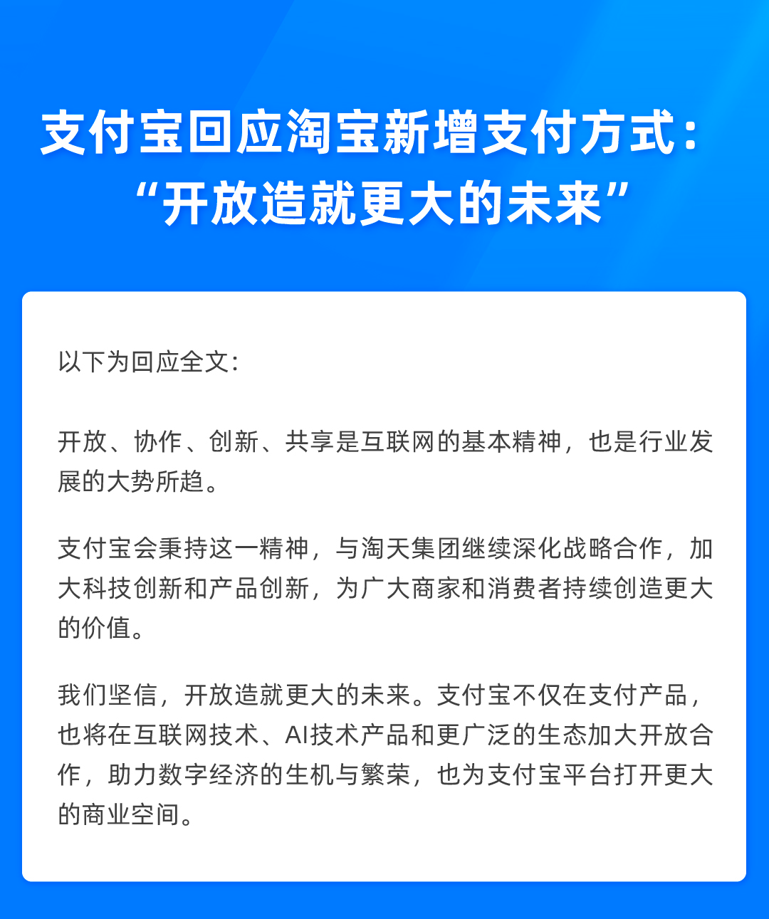 对此,支付宝回应称:“开放、协作、创新、共享是互联网的基本精神,也是行业发展的大势所趋。支付宝会秉持这一精神,与淘天集团继续深化战略合作,加大科技创新和产品创新,为广大商家和消费者持续创造更大的价值。我们坚信,开放造就更大的未来。支付宝不仅在支付产品,也将在互联网技术、AI技术产品和更广泛的生态加大开放合作,助力数字经济的生机与繁荣,也为支付宝平台打开更大的商业空间。”
