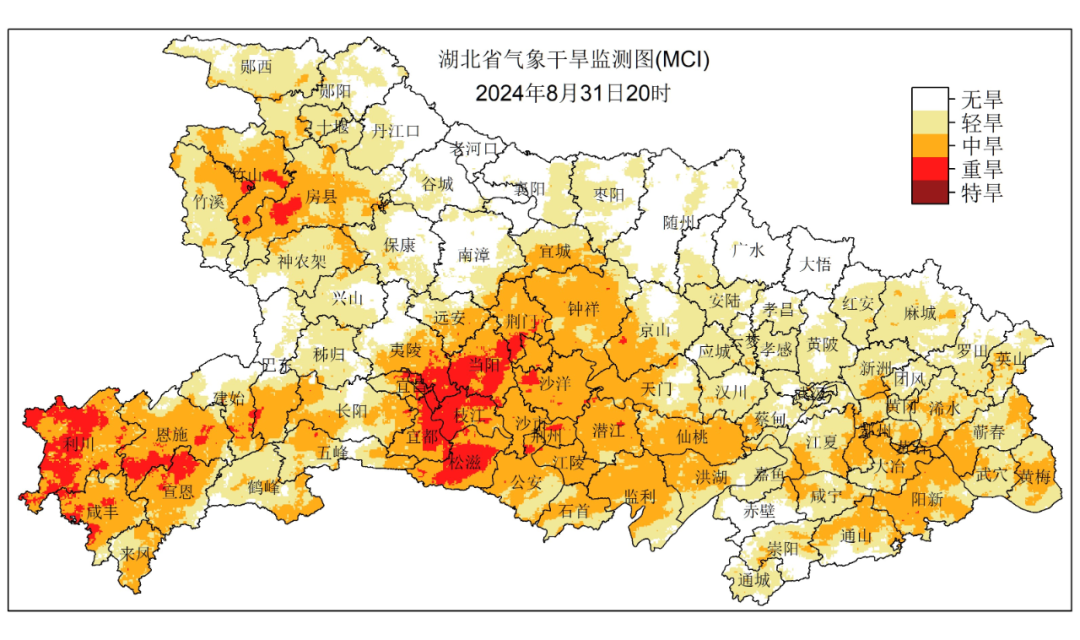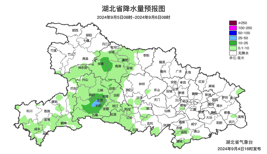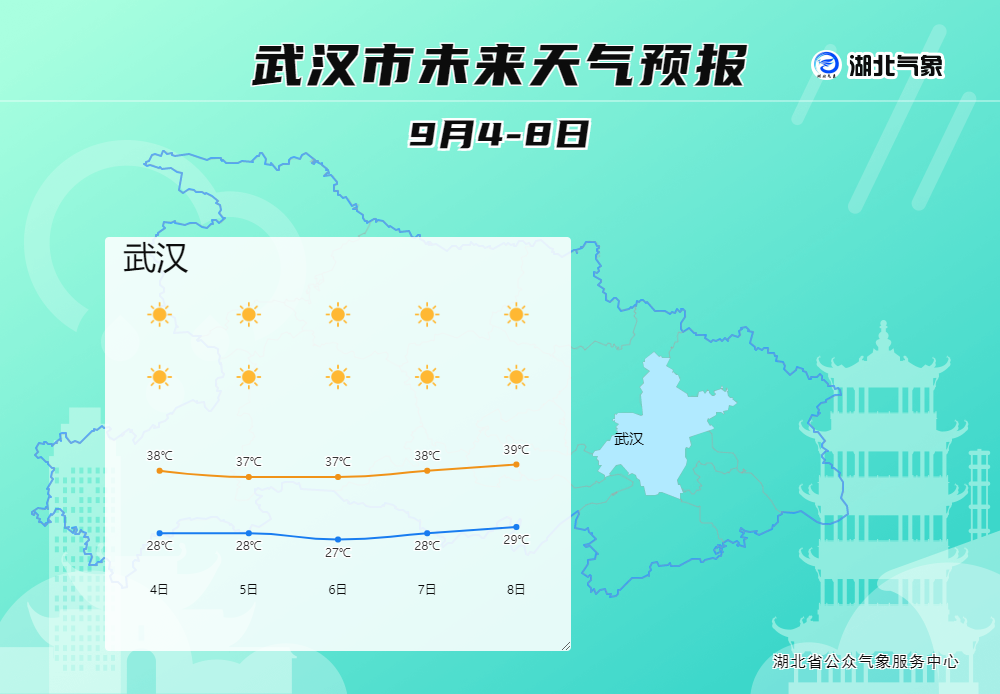 预计9月13日以前,全省大部分地区晴热高温天气将持续。最高气温35~39℃、局地40℃以上。需要注意的是:5日前后,受弱冷空气影响,全省有分散性阵雨或雷阵雨,局地有短时强降水、雷暴大风等强对流天气,提醒大家外出注意携带雨具。未来两天冷空气会给鄂西北地区带来明显降温,但是对其它地区气温影响不大,预计13日以后全省高温强度将有所减弱。
