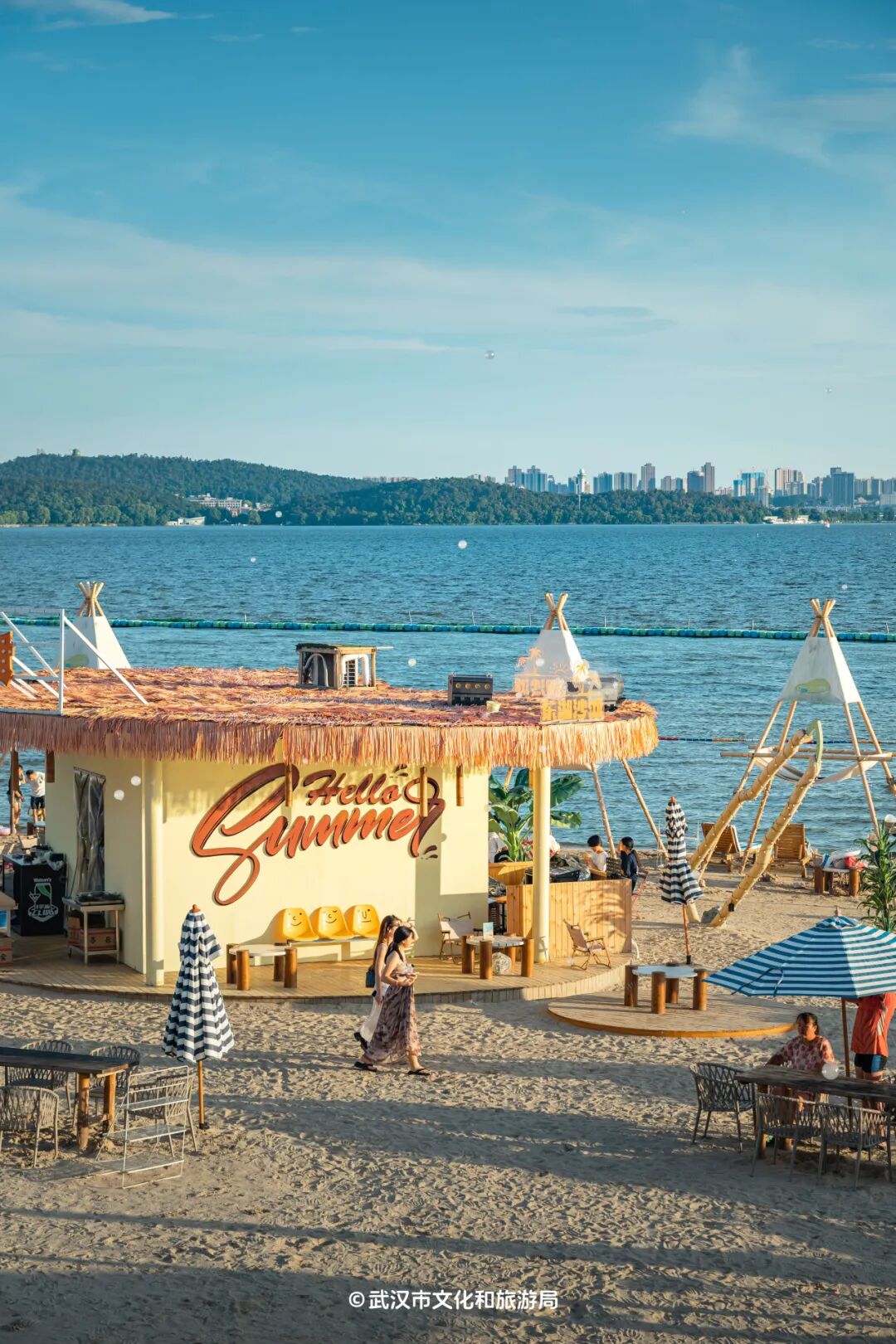 这里是武汉最像海边的地方,有柔软沙滩,湛蓝水面,日落很美。换上泳衣泡进东湖水里,打卡武汉首个水上漂浮影院。