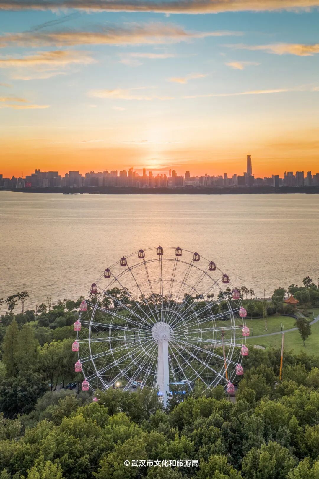 傍晚坐进东湖边的粉色摩天轮,升至49米高空看落日熔金。