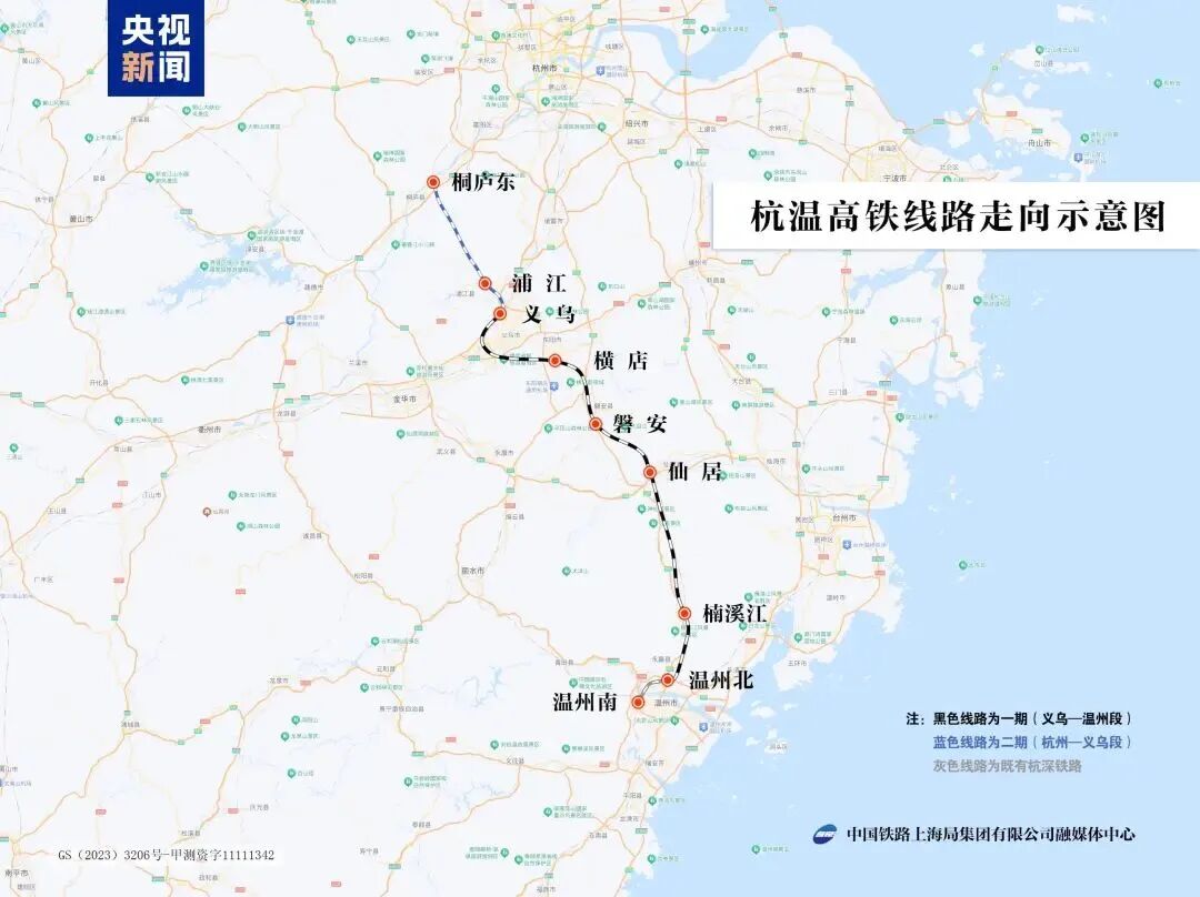 △杭温高铁全长276公里,设计时速350公里,全线设桐庐东、浦江、义乌、横店、磐安、仙居、楠溪江、温州北、温州南等9座车站。