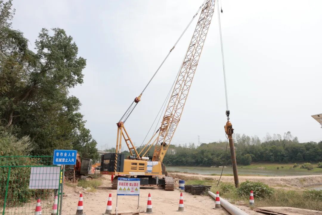 9月3日,在红安县八里湾镇洪家塆倒水河大桥施工现场,中铁一局的工程人员正在对洪家塆倒水河大桥钢栈桥进行紧张施工。