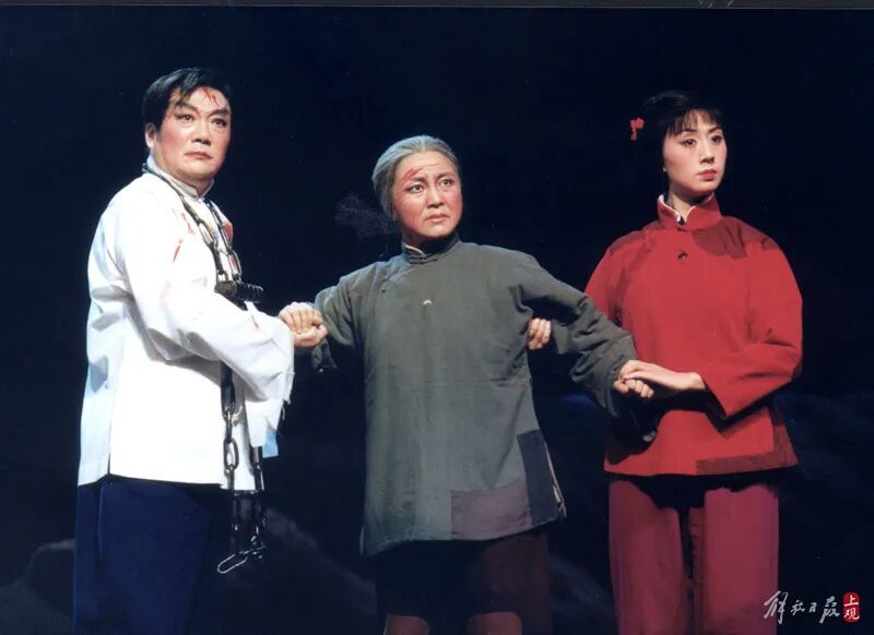 为纪念反法西斯战争胜利55周年,上海京剧院复排的现代京剧《红灯记》在逸夫舞台首演。图为李玉和(章晓申饰)、李奶奶(胡璇饰)和李铁梅(史依弘饰) 祖孙三代雄赳赳气昂昂赴刑场。