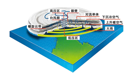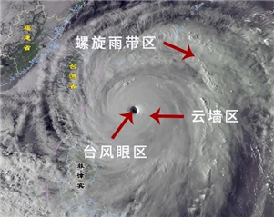 台风的结构,从中心向外依次分为:台风眼区(中心)、台风眼壁(云墙)、螺旋雨带三部分。