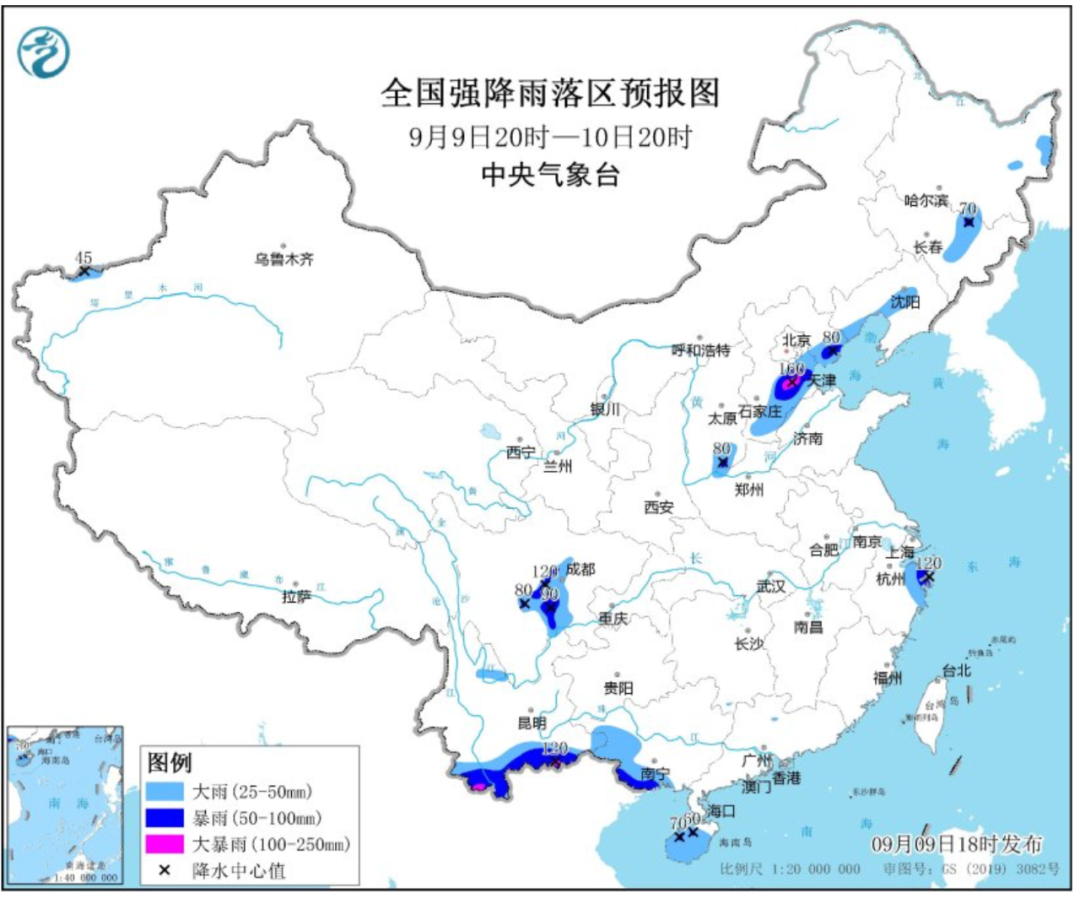 中央气象台预计,9日20时至10日20时,山西南部、河北中南部和东部、天津、辽宁中西部、吉林中部、黑龙江东部、四川盆地西部、云南南部、广西西南部、海南岛、浙江东北部、新疆南疆西部山区等地部分地区有大到暴雨,其中,河北中部、四川盆地西部、云南南部、浙江东北部沿海等地局地有大暴雨。
