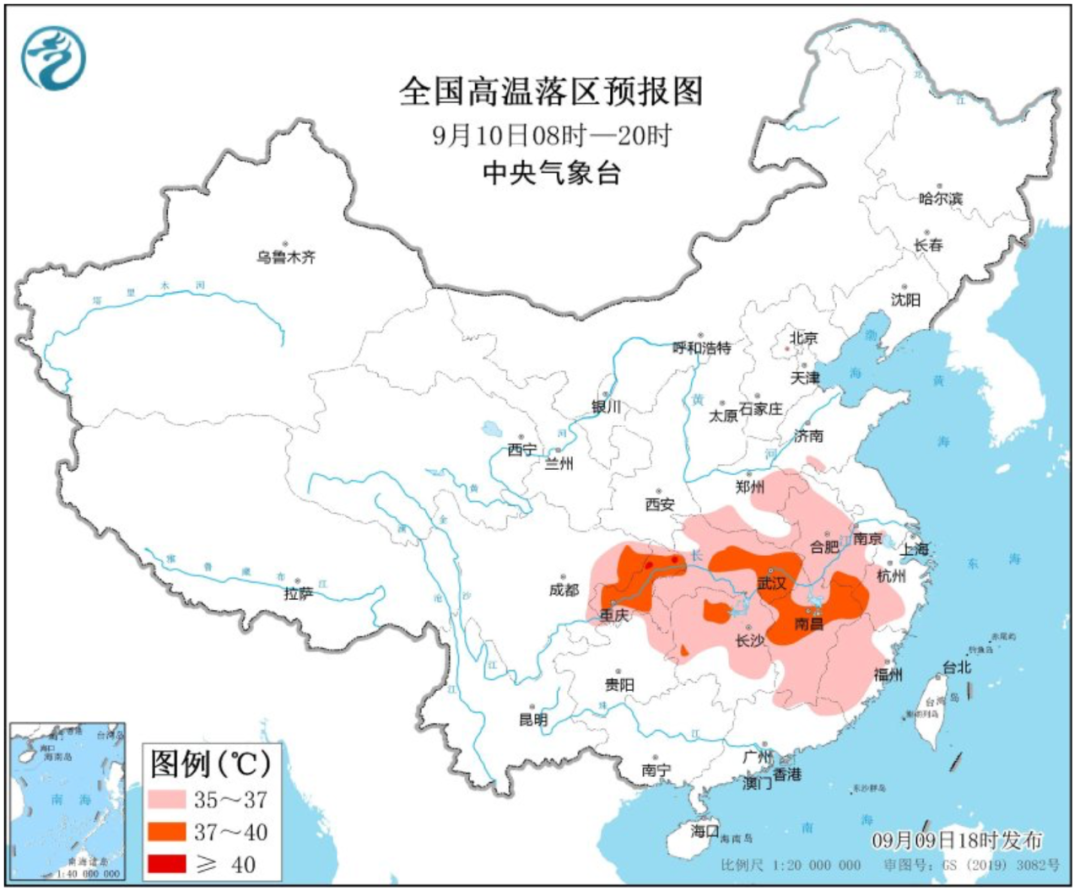 中央气象台预计,10日白天,河南东部和南部、安徽、湖北、湖南中北部、江西、浙江中西部、福建大部、四川东部、重庆、贵州东北部、广东东北部等地有35~36℃高温天气,其中,安徽南部、湖北中东部、湖南北部、江西中北部、浙江西南部、四川东北部、重庆等地部分地区最高气温37~39℃,重庆东北部局地可达40℃以上。