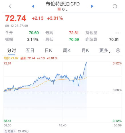 美东时间9月12日,国际油价也暴涨,WTI原油日内涨超3.5%,布伦特原油涨超3%。
