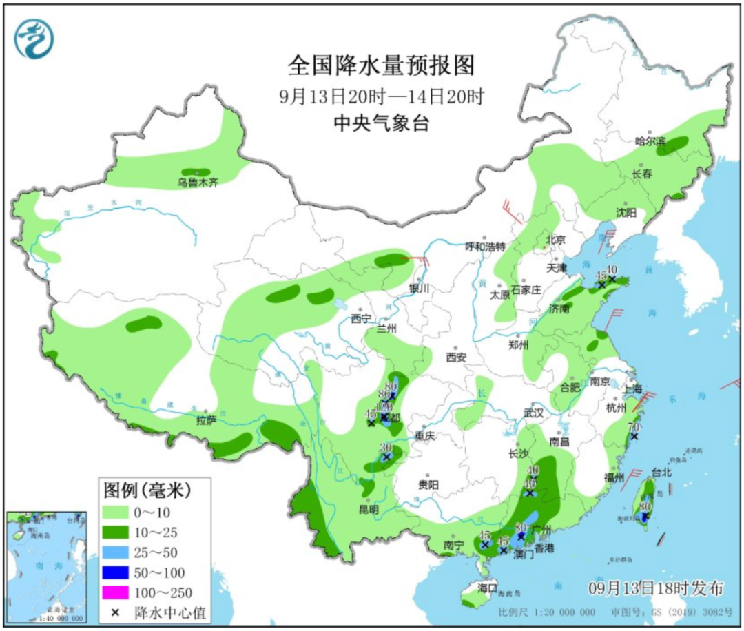 中央气象台预计,13日20时至14日20时,内蒙古西南部、黑龙江东南部、西藏南部和西北部、青海北部、山东北部、江苏北部、浙江东部、四川盆地西部、云南东北部和西南部、江西中南部、广西东南部、广东中西部、台湾岛大部等地部分地区有中到大雨,其中,浙江东南部、四川盆地西部、广东西南部、台湾岛南部等地部分地区有暴雨或大暴雨。