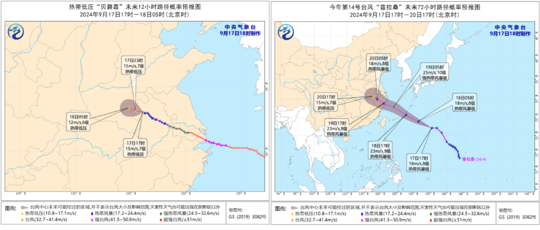 中央气象台17日18时继续发布台风蓝色预警:今年第13号台风“贝碧嘉”已于当日下午减弱为热带低压,并于夜间移入河南境内;今年第14号台风“普拉桑”(热带风暴级)将以每小时35—40公里的速度向西偏北方向快速移动,预计19日下午至晚上于浙江沿海登陆。
