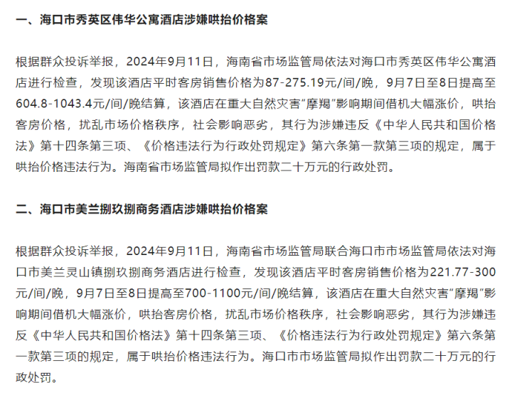 日前,海南省市场监管局对4起哄抬价格案件发出行政处罚告知书,4家酒店均被处罚。其中一家公寓酒店平时客房销售价格为87元至275.19元/间/晚,9月7日至8日,提高604.8元至1043.4元/间/晚。