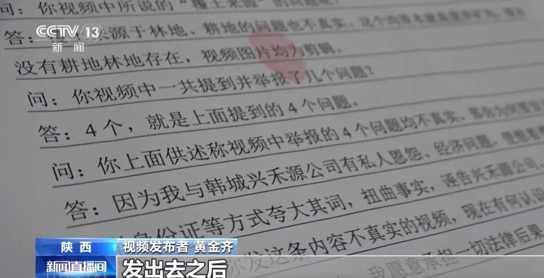 经多方联合调查,9月5日联合调查组向记者介绍,在网上发布举报视频的男子叫黄金齐,视频举报的内容均为捏造,目前已经被行政拘留,在得到当地公安部门的允许后,总台记者在韩城市看守所见到了黄金齐。