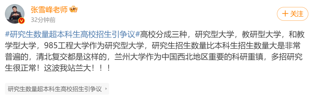 张雪峰写道:“高校分成三种,研究型大学,教研型大学,和教学型大学,985工程大学作为研究型大学,研究生招生数量比本科生招生数量大是非常普遍的,清北复交都是这样的,兰州大学作为中国西北地区重要的科研重镇,多招研究生很正常!这波我站兰大!”