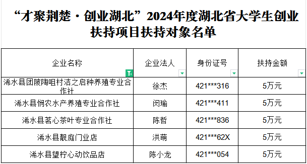浠水县5个项目分别荣获“才聚荆楚 创业湖北”2024年度湖北省大学生创业扶持资金5万元。