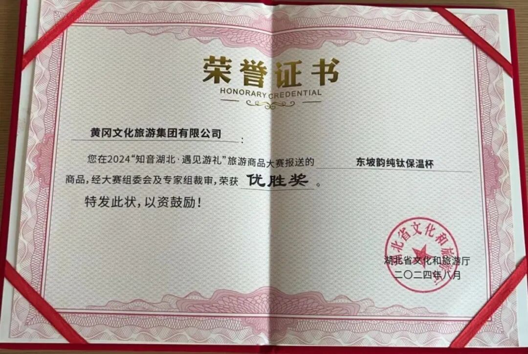 在湖北省文旅厅举办的2024“知音湖北 遇见游礼”旅游商品大赛中,黄冈的文创产品黄梅挑花获得金奖、东坡韵纯钛保温杯获得优胜奖;在长江文化艺术季中,东坡韵东坡小卷轴拟获“书香长江·十佳文创产品”,黄冈文化旅游集团有限公司拟获“书香长江·十佳文创企业”。其中东坡韵-纯钛保温杯还被推荐参与2024中国特色旅游商品大赛。