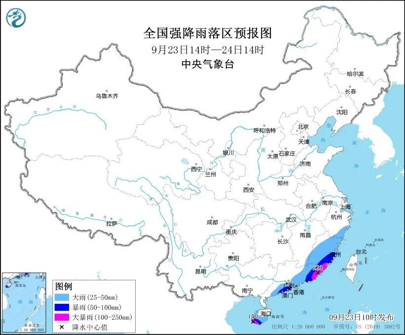预计,9月23日14时至24日14时,浙江东南部、福建大部、广东东部和南部、海南岛等地部分地区有大到暴雨,其中,福建南部、广东东部、海南岛西南部等地部分地区有大暴雨(100~220毫米)。上述部分地区伴有短时强降水(最大小时降雨量20~40毫米,局地可超过50毫米)等强对流天气。