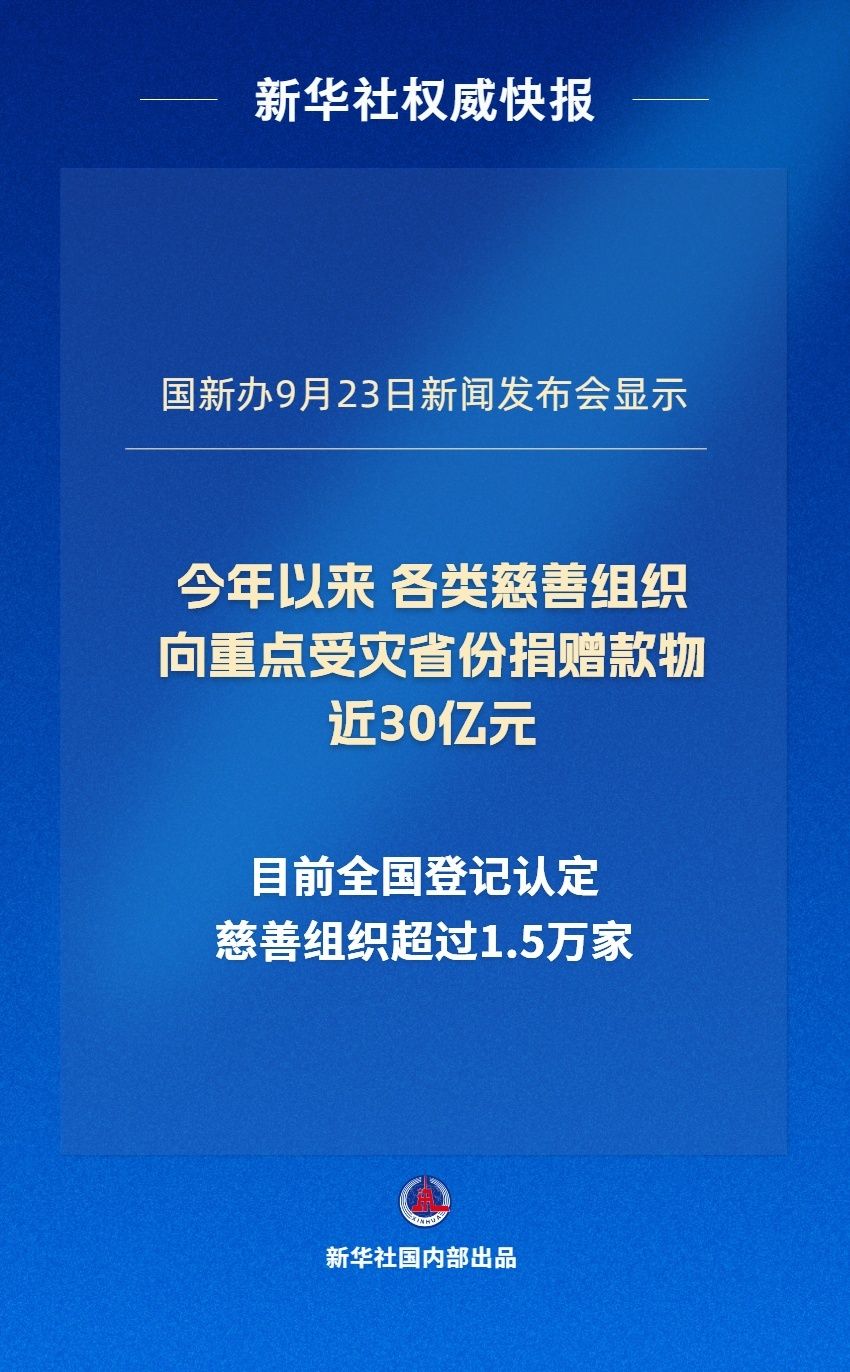 记者从9月23日国务院新闻办举行的“推动高质量发展”系列主题新闻发布会上获悉,今年以来各类慈善组织向重点受灾省份捐赠款物近30亿元。截至目前,全国登记认定的慈善组织超过1.5万家,公益慈善在乡村振兴、科教文卫、生态保护、应急救援等多个领域发挥了重要作用。