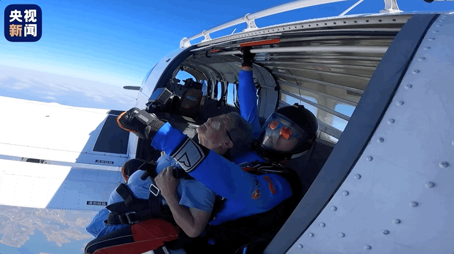 一切准备就绪,在教练的指引下,陶奶奶一跃而下,进行了35秒的自由落体。