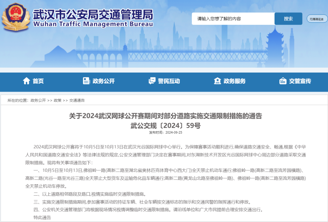 9月25日,武汉市公安局交通管理局发布《关于2024武汉网球公开赛期间对部分道路实施交通限制措施的通告》: