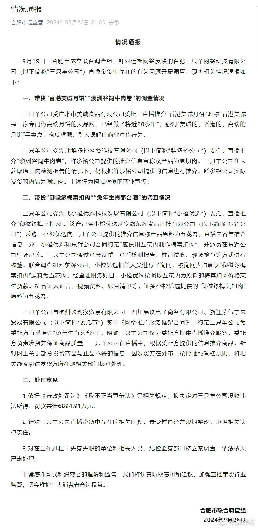 合肥市联合调查组通报三只羊公司有关问题调查结果