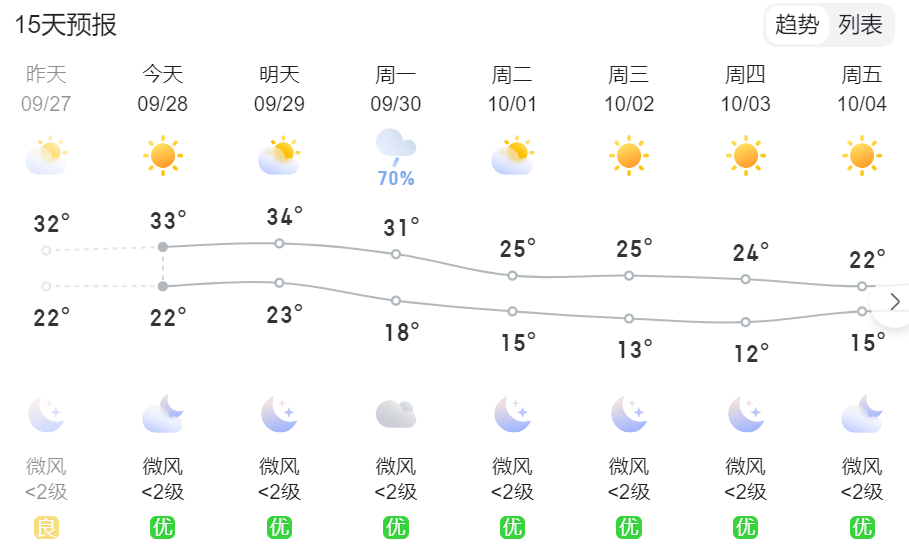 降雨将于29日开始,西部有小到中雨、局地大雨,中东部多云到阴天,部分地区有阵雨,初步预计10月2日至7日,全省以晴到多云天气为主,气温舒适,最高气温24~27℃。