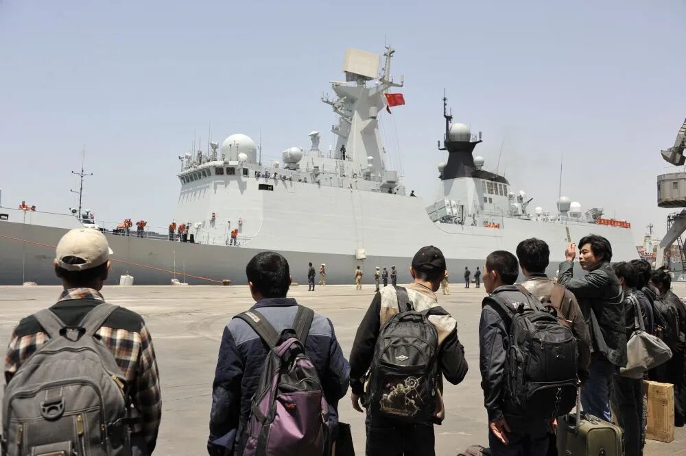 2015年3月30日,中国公民在也门西部荷台达港排队等候登舰撤离。新华社发(汉尼·阿里 摄)
