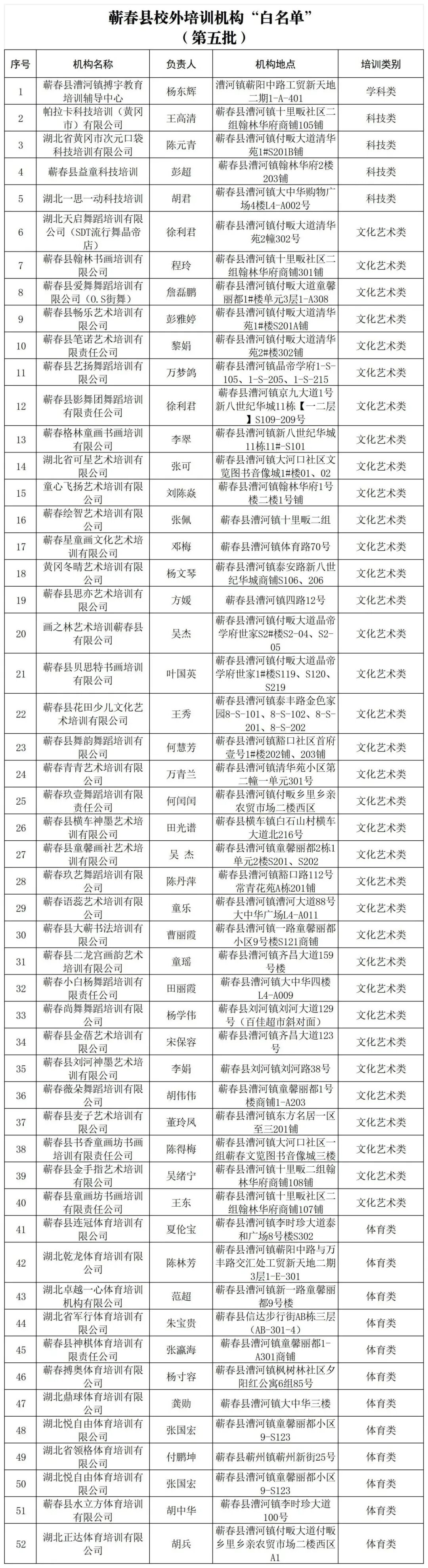 为进一步规范蕲春县校外培训机构培训行为,加强对校外培训机构的全流程监管,根据省教育厅、省科学技术厅、省文化和旅游厅、省体育局四部门联合下发的《关于进一步加快推进全国校外培训监管与服务综合平台等工作的通知》(鄂教监管办函[2023]10号)文件要求,现将蕲春县校外培训机构“白、灰、黑”名单(第五批)向社会公布(截止2024年9月30日),提醒广大学生及家长理性参加校外培训,选择合法合规的培训机构,避免自身利益受到损害。