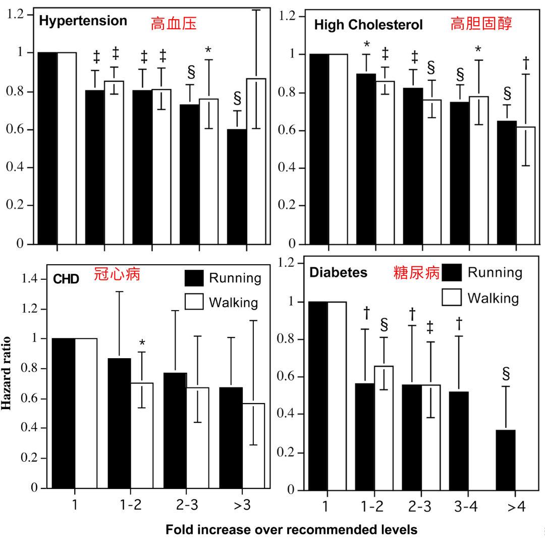 研究发现,每增加 1 MET(代谢当量)的能耗,跑步与走路在降低糖尿病和 CHD 风险上没有显著差异,但是走路在降低高血压和高胆固醇血症风险上略高于跑步。