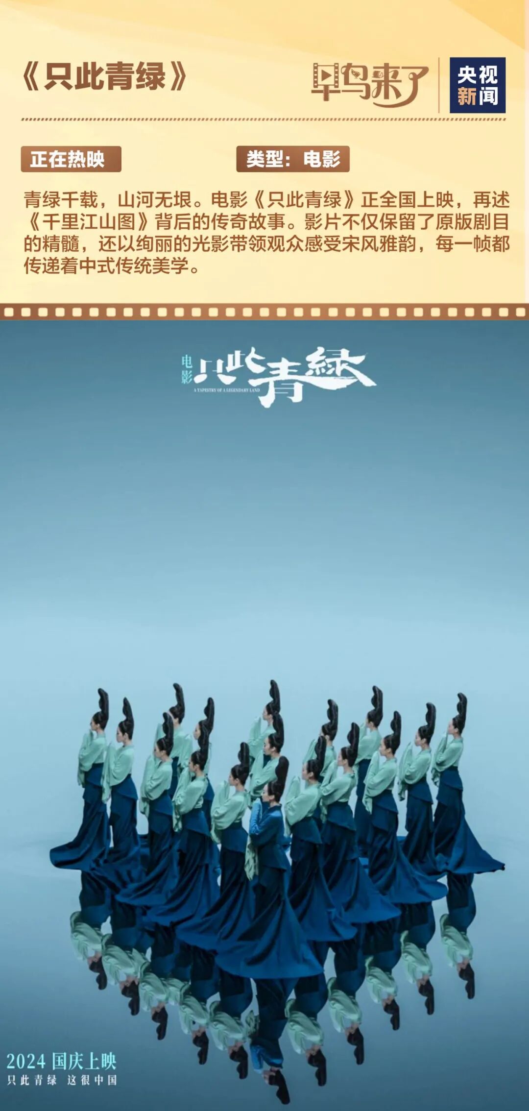 青绿千载,山河无垠。电影《只此青绿》正全国上映,再述《千里江山图》背后的传奇故事:宋代少年希孟燃尽一生,绘制画卷,织绢人、制笔人、磨石人、制墨人、篆刻人等无数工艺人展现智慧,共同制成这幅流传千古的旷世之作。更多内容