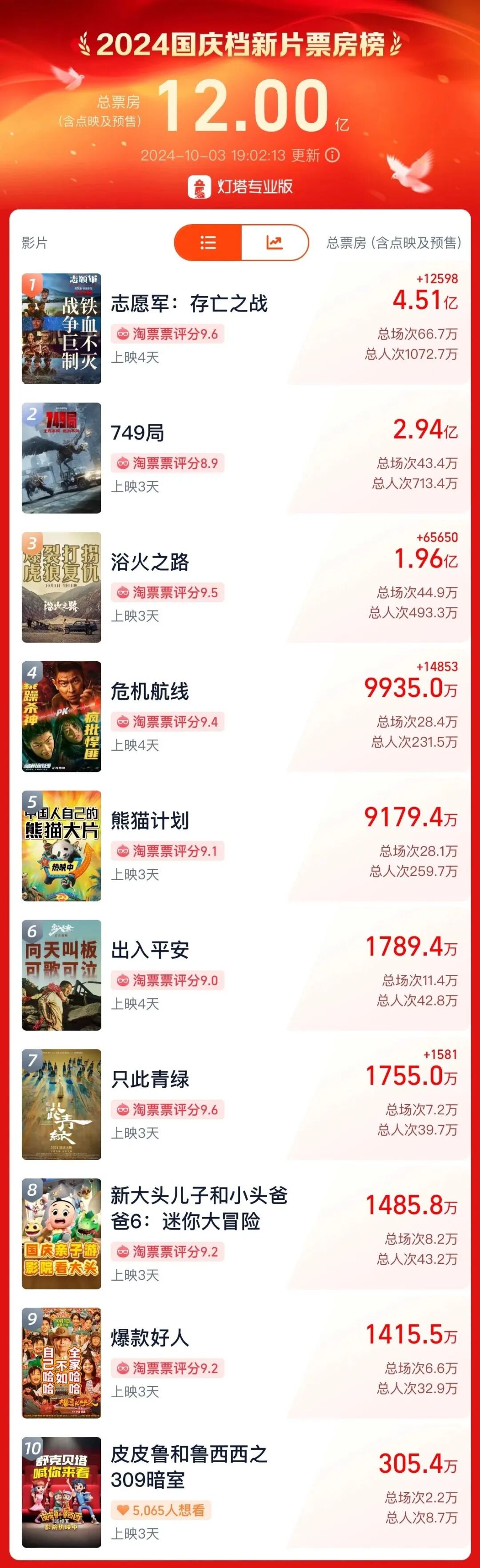 “国庆七天乐,不想出去人挤人。我准备每天看一部电影,10月1日看了《749局》,10月2日看了《志愿军:存亡之战》,10月3日看《变形金刚:起源》,10月5日看《浴火之路》。”温州市民林女士,对自己的国庆假期安排很满意。