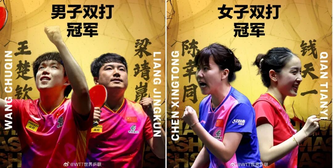 5日,中国组合王楚钦/梁靖崑、陈幸同/钱天一分获2024年WTT中国大满贯男子双打、女子双打冠军。