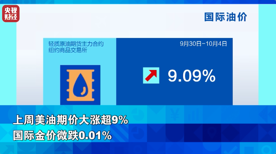 上周在伊朗对以色列发动导弹袭击后,中东紧张局势升级推高原油价格,国际油价连涨四日,全周美油期价累计上涨9.09%,创2023年3月以来最大单周涨幅,布油期价则累计上涨8.43%。市场对美联储大幅降息的预期降温,国际金价上周累计微跌0.01%。