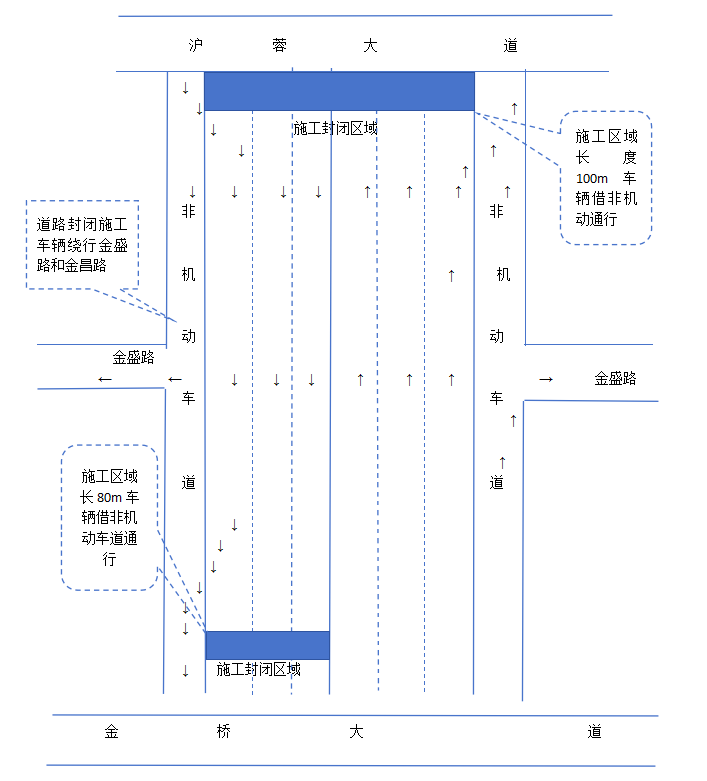 管制路段采取封闭施工,除施工以外的一切车辆禁止驶入或停放。四、注意事项施工期间,请途经此路段的车辆驾驶人按照施工标志牌提示,绕行金盛路、金昌路。请施工路段附近小区、商户车辆绕行非机动车道,服从现场工作人员指挥,注意观察路面,谨慎出行。因道路施工给过往车辆及居民出行带来不便,敬请谅解。