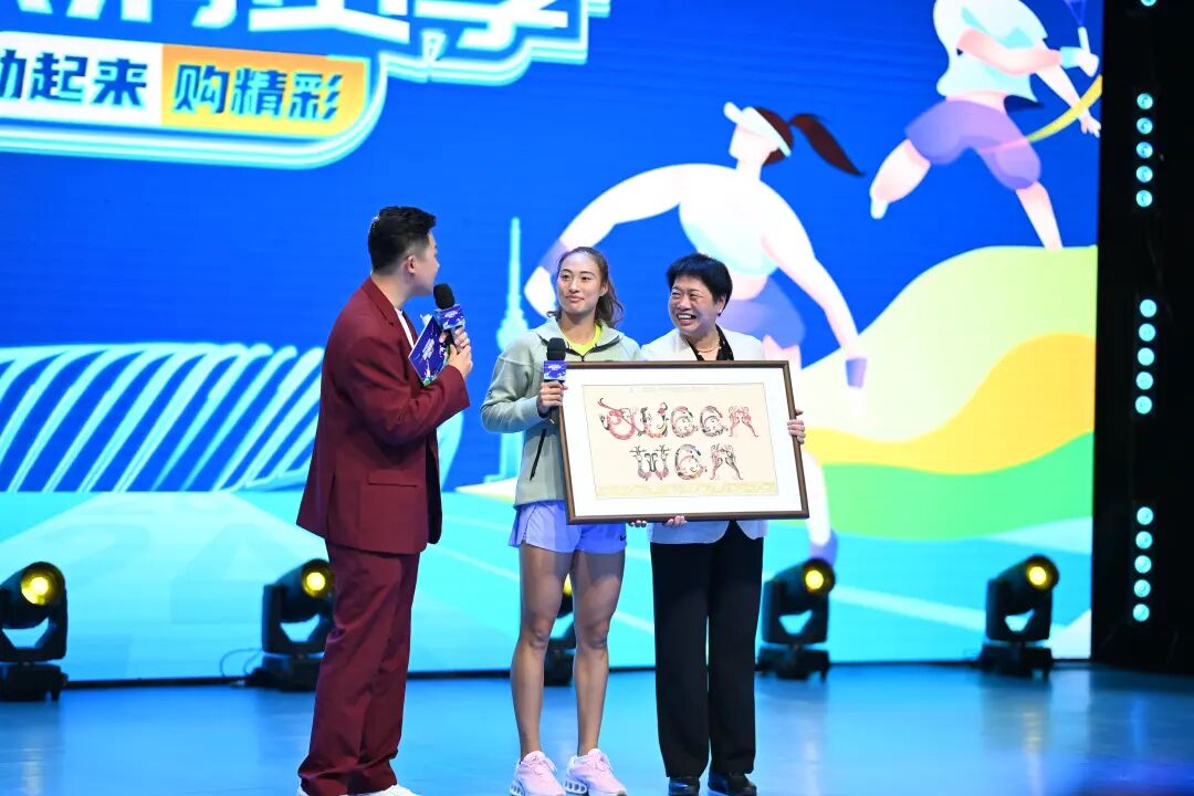 生日会现场,郑钦文收到了一份印有“QUEEN WEN”字样的楚绣,她说完全感受到了家乡人民的热情,这份特别的礼物她很喜欢。