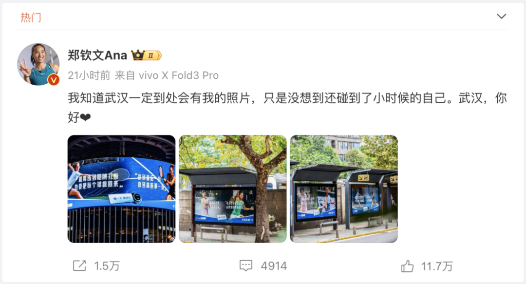 郑钦文在微博分享她感受到的武汉热情