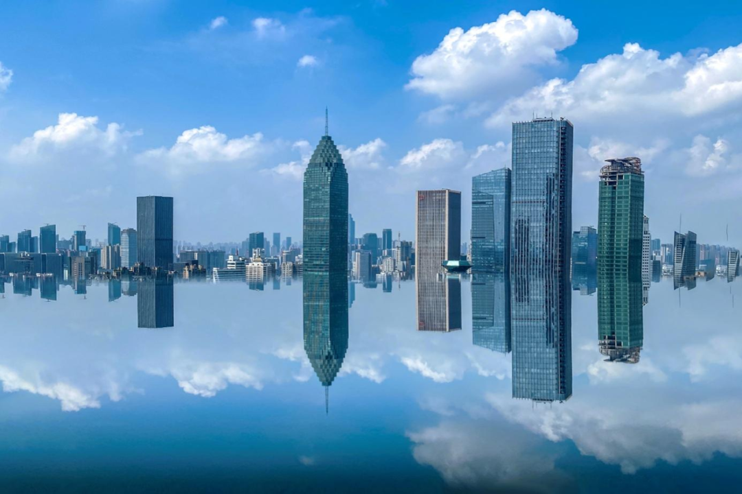 说明:将高耸入云的高楼,通过对称的手法映照在蓝天白云中,从独特的角度展现了武汉市的美。
